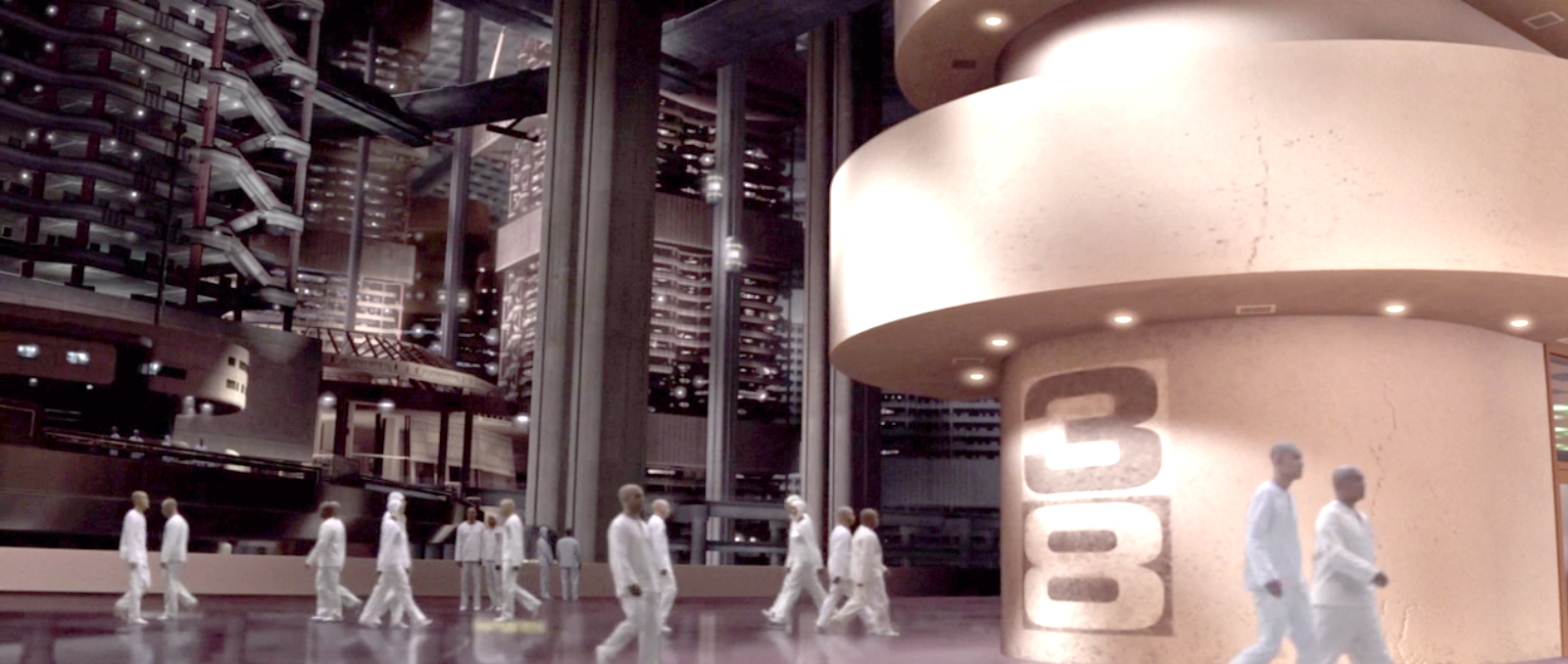 En THX 1138 (1971), dirigida por George Lucas, la arquitectura se presenta como un sistema espacial abstracto, repetitivo y despersonalizado. Los grandes vacíos, las superficies lisas y la ausencia de referencias identitarias configuran un entorno que anula la individualidad y refuerza el control social. En este contexto, el espacio construido opera como una extensión directa del aparato normativo, alineándose con una lectura crítica de la modernidad en la que la arquitectura deja de mediar entre el individuo y la sociedad para convertirse en un instrumento de regulación total.