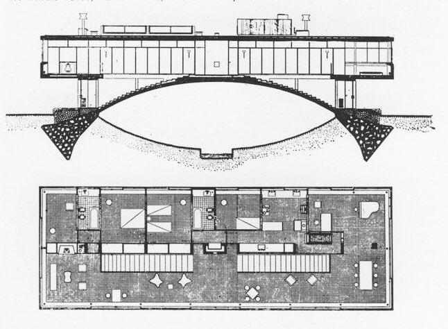 La influencia de Le Corbusier es innegable, especialmente en la voluntad de liberar el plano del suelo y afirmar la autonomía del objeto arquitectónico. Sin embargo, la sustitución de los pilotis por un único arco estructural marca una diferencia sustancial. El puente no es un sistema repetible: es un gesto poético que vuelve inseparable a la forma de la idea que la origina.